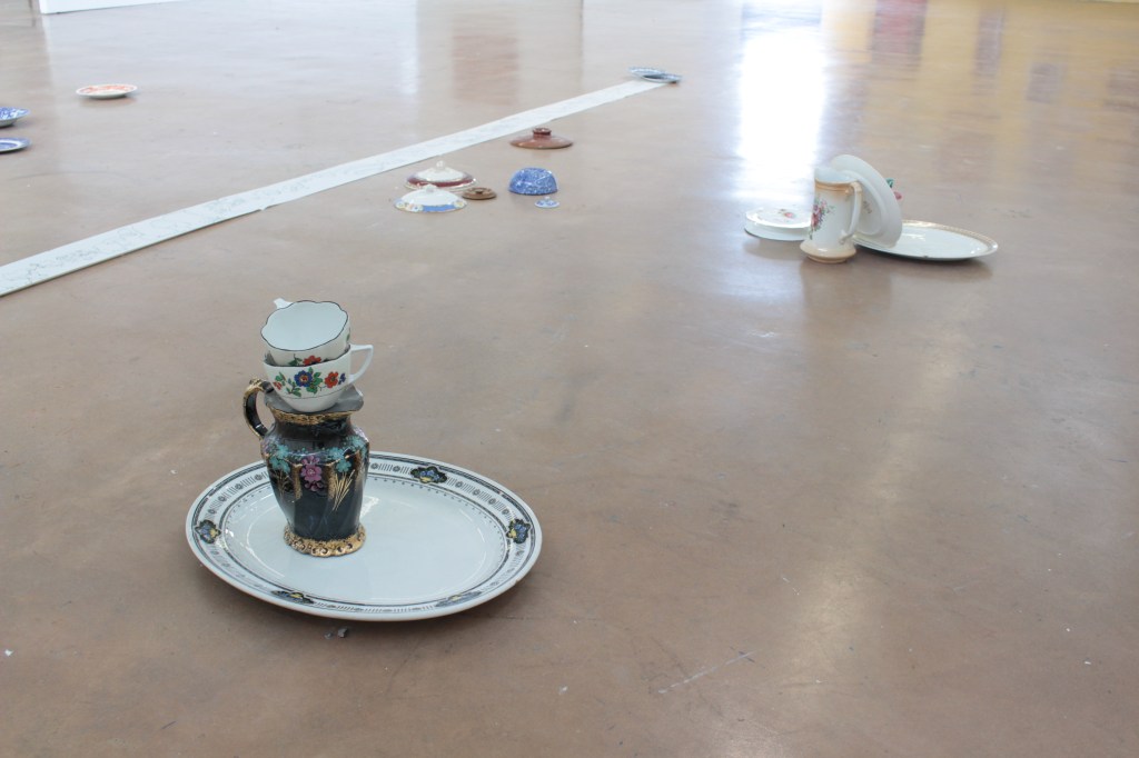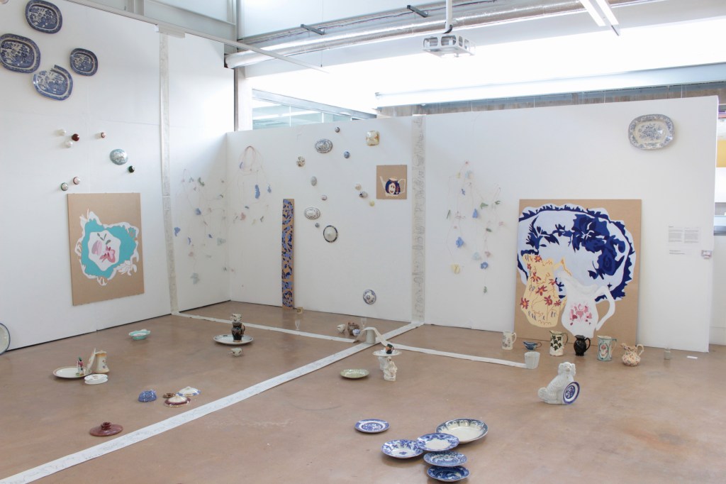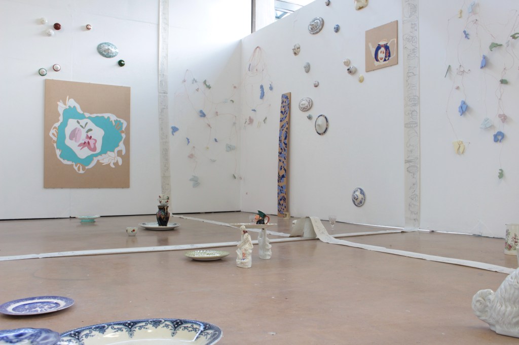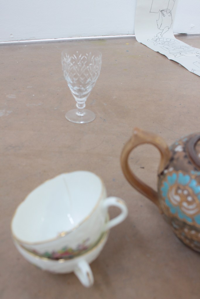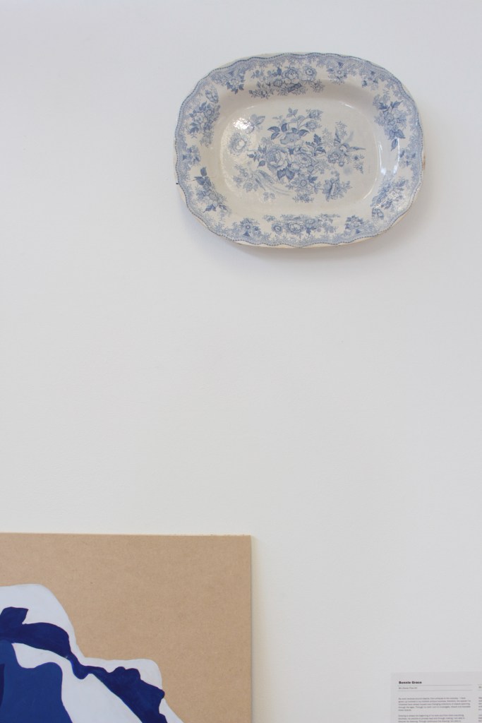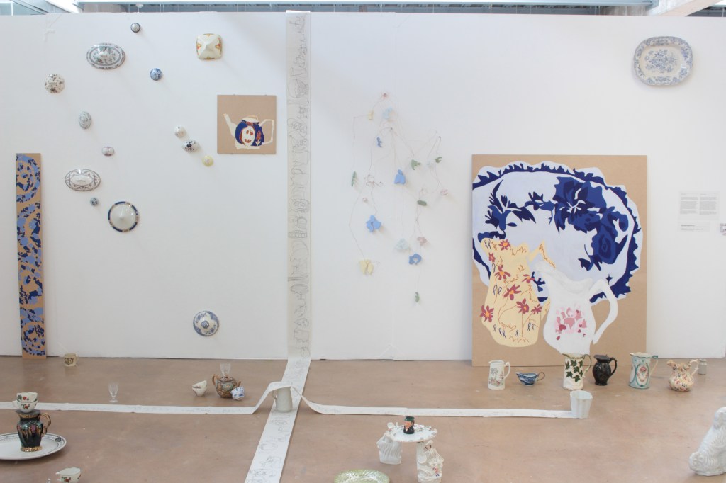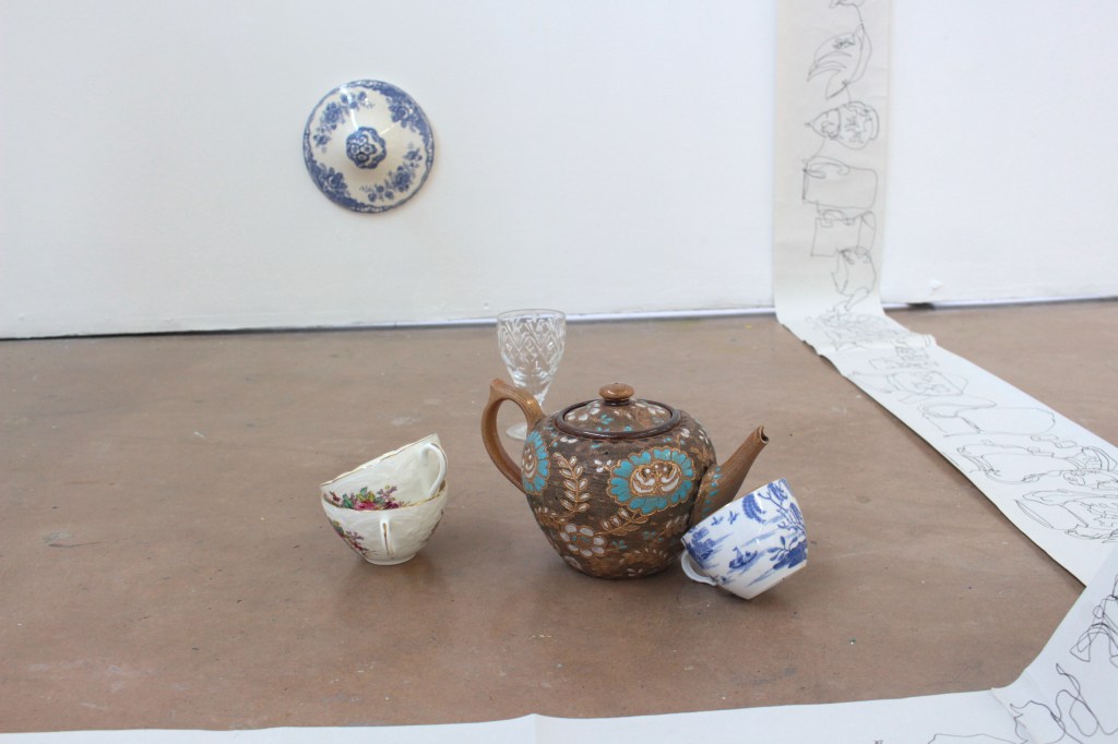 Drawing is always the beginning of my work and from there everything develops, my practice is process lead and through making, I am able to discover its meaning. Through continuous line drawing I am able to disconnect from the object and take my work beyond what I see before me in order to explore it further. In my work I also question the importance of objects. Traditionally, imperfect objects with cracks, chips, stains and breakages, would be considered less valuable, but to me these imperfections add value by revealing their past and characteristics. The concept of displacement plays a roll in my work by challenging the conventional expectations of presentation. Plates discarded on the floor, lids proudly hung on the wall, piles of assembled ‘antiques’ precariously balanced.