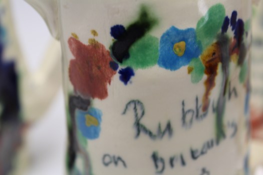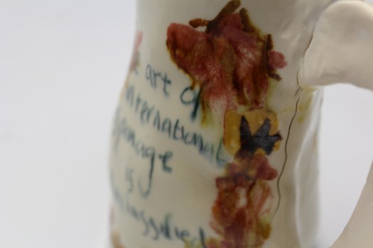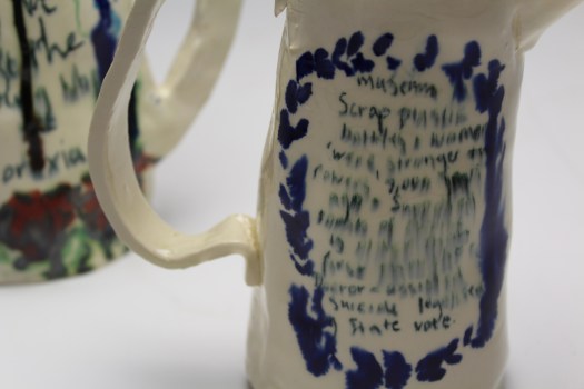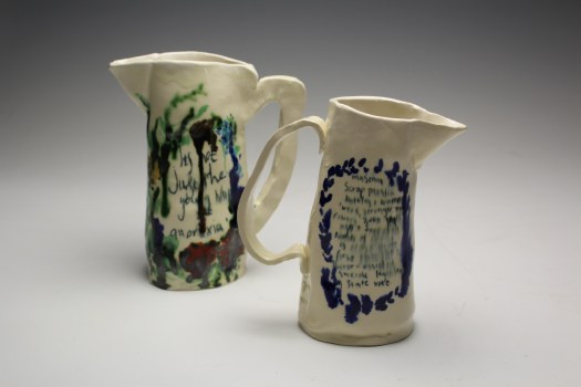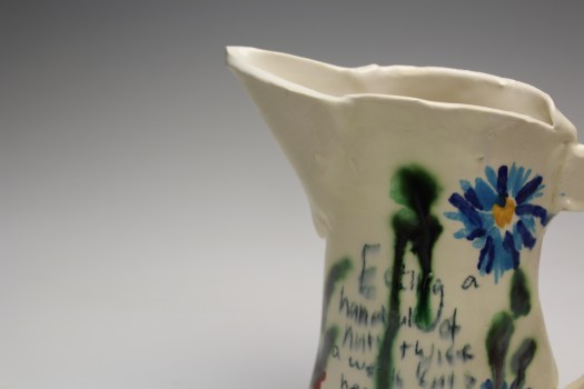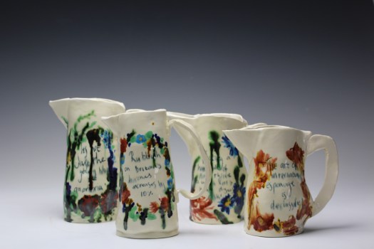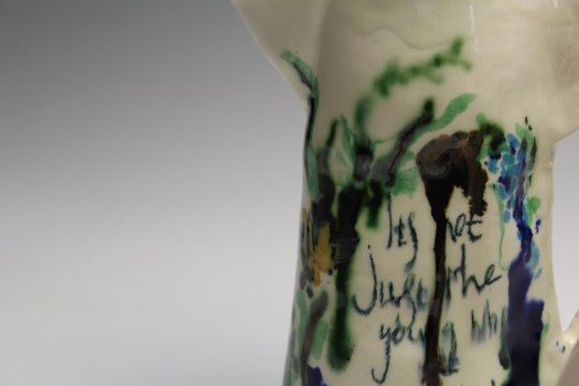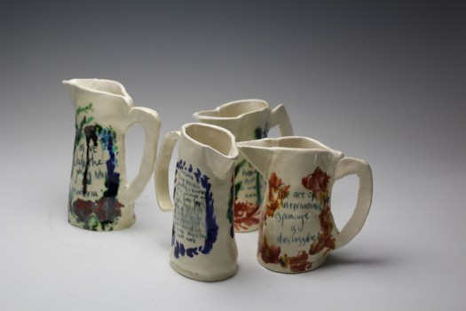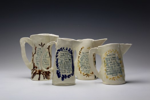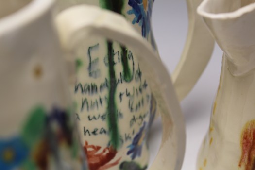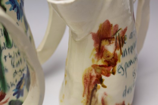 The designs around the text were inspired by antique jugs in Cardiff museum and the V&A and recreated using coloured tin glazes. During the firing process the glazes & pencil ran bleeding into each other & running down the jugs, distorting & hiding what is on the jug