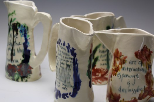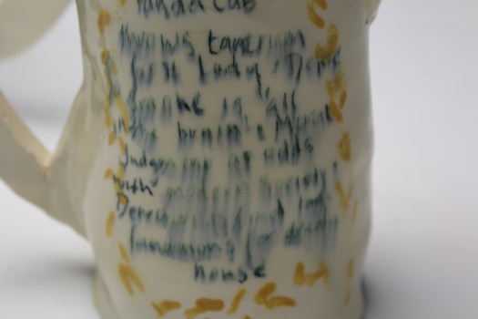 Beginning as commemorative project involving ceramics, ‘yesterdays headlines’ was my interpretation of commemorative ware. Using the ‘not front page’ newspaper headlines I ‘commemorate’ on my jugs body. Archiving the headlines that would have been forgotten or thrown away if kept on paper.